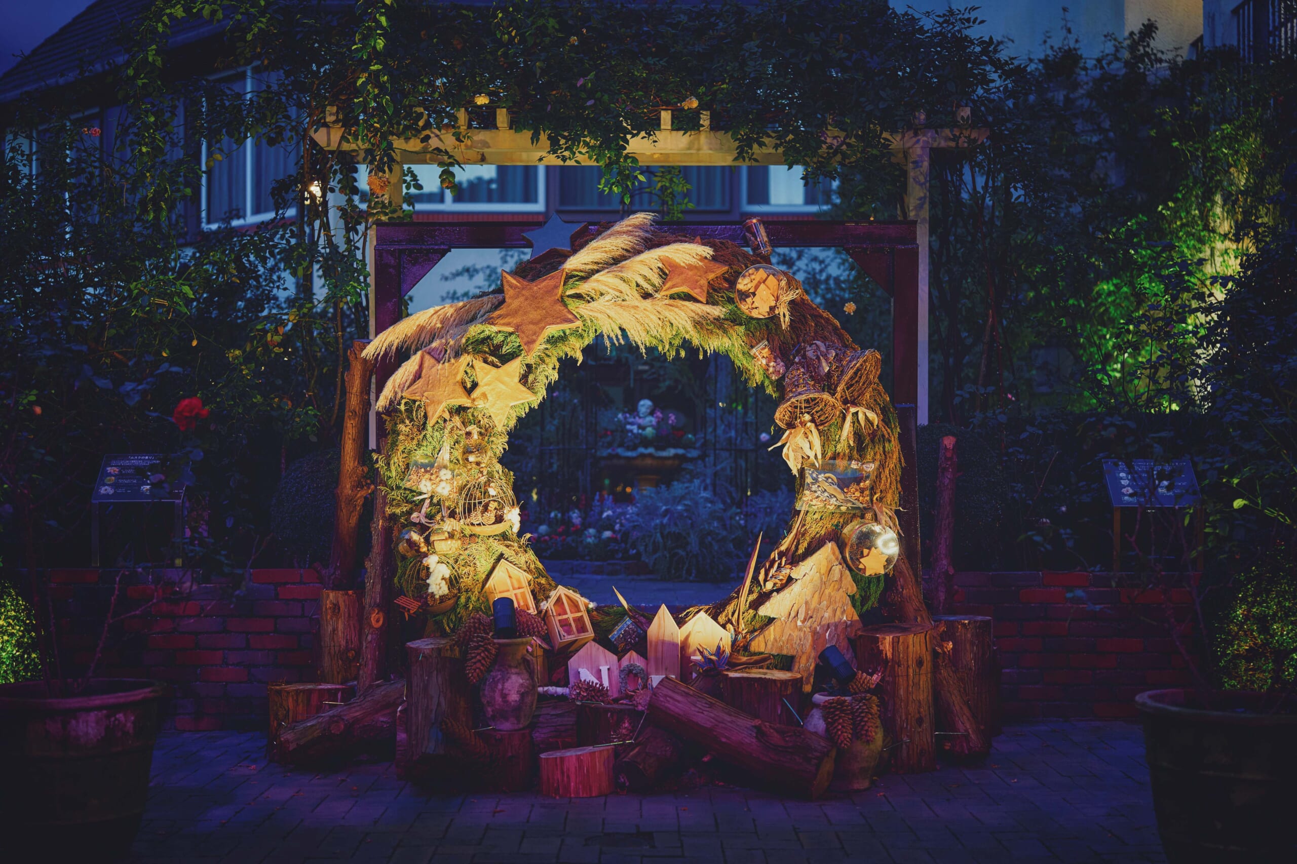 古城の広場は「ボタニカル」をテーマにしたクリスマス仕様に。ハーブ園ならではの自然素材を使用したディスプレイに心が癒されます。16時に点灯されるクリスマスタワー「自然の力」は、ドイツトウヒや木の実、園内の剪定枝等を使ったオリジナルデザイン。