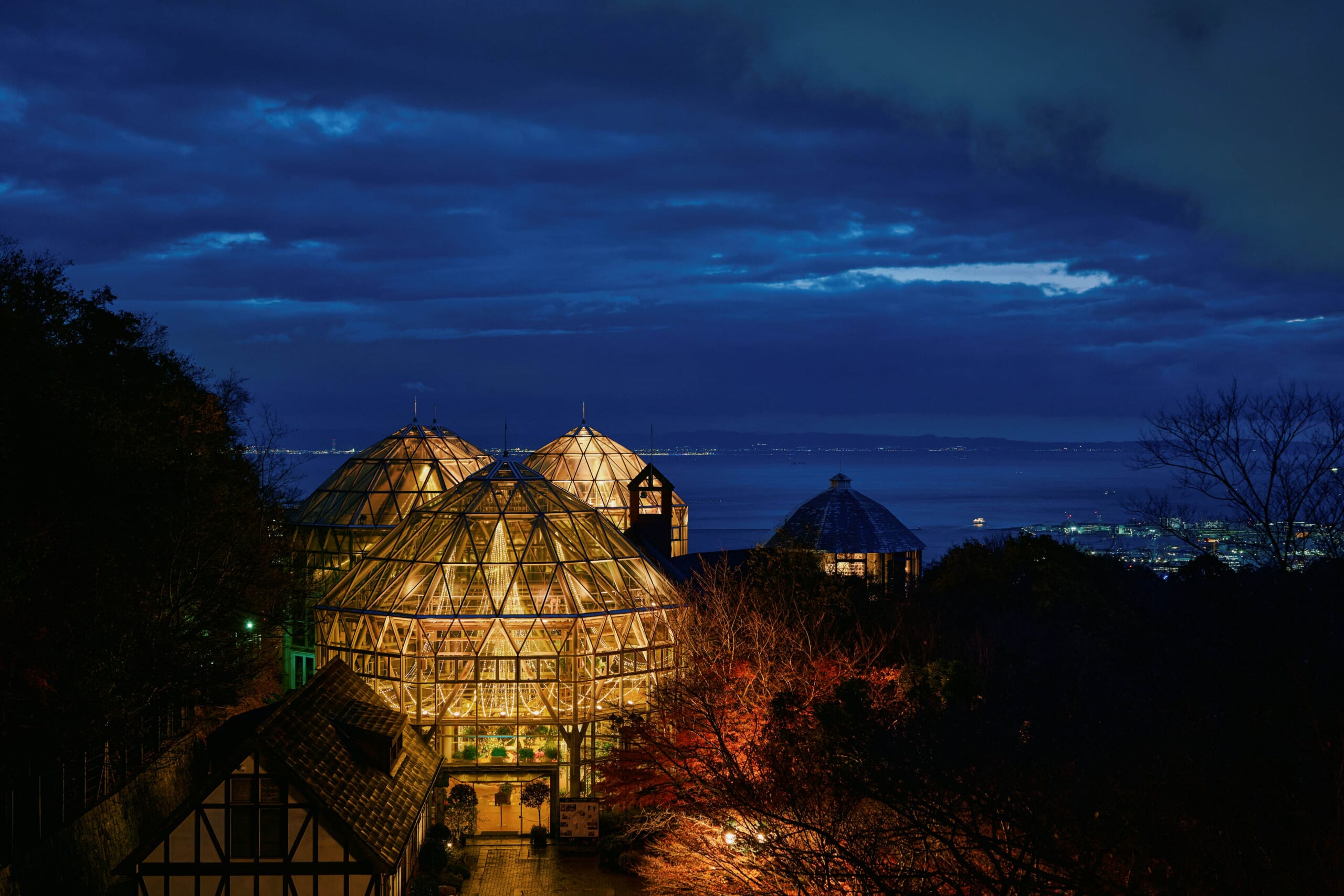 園の森にたたずむ高さ25mのメタセコイアが、約1600球の電球をまとってクリスマスツリーに大変身。周辺の木々もライトアップされ、グラスハウスエリアへ続く園路が煌めく「光の回廊」に変貌します。ロープウェイの車窓に神戸の夜景とツリーが映る、最高にロマンチックな体験です。