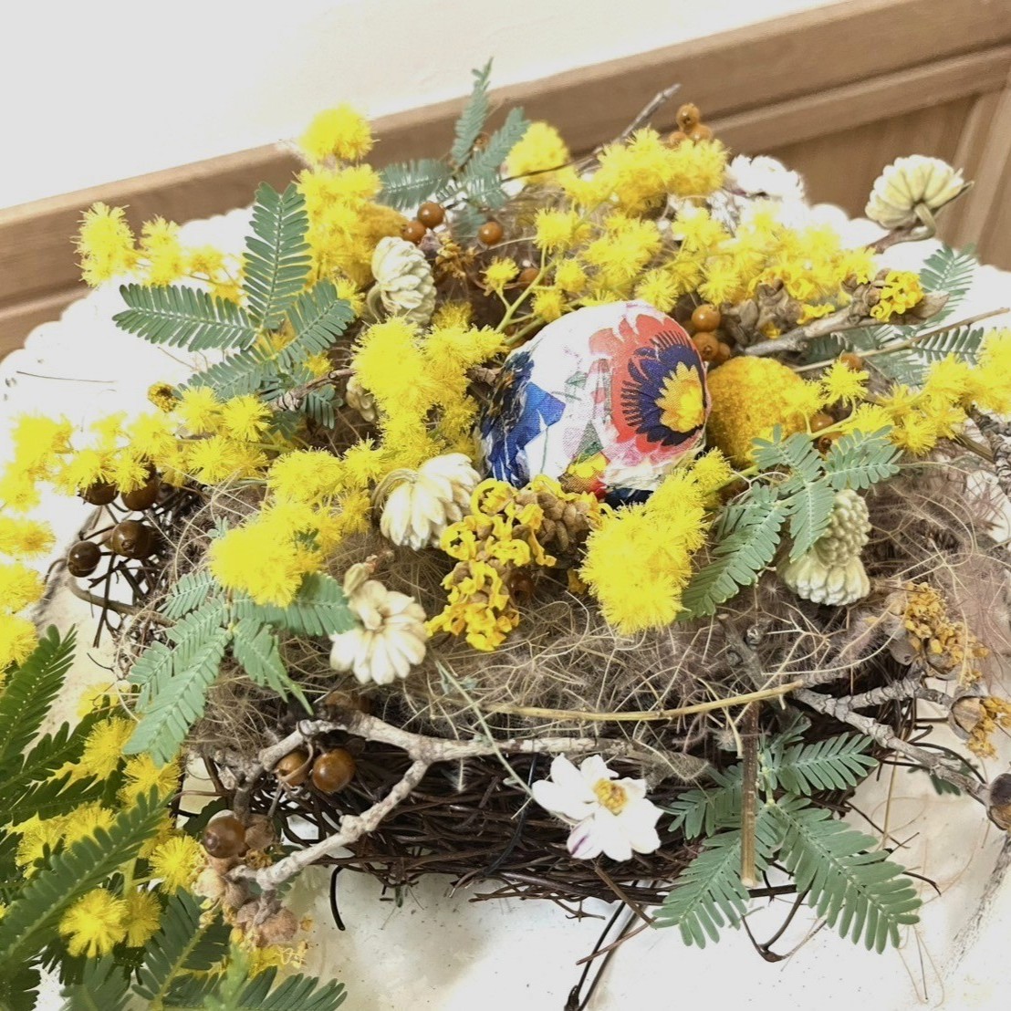キリスト教において最も重要な行事、かつ春の訪れを祝うイースター(復活祭)は、卵(イースターエッグ)をモチーフにした飾りで祭りを彩るのが定番。早春フェスタでは「スモークツリー」や「ミモザ」といった公園の草木を使用し、鳥の巣風のアレンジメントを体験することができます。
