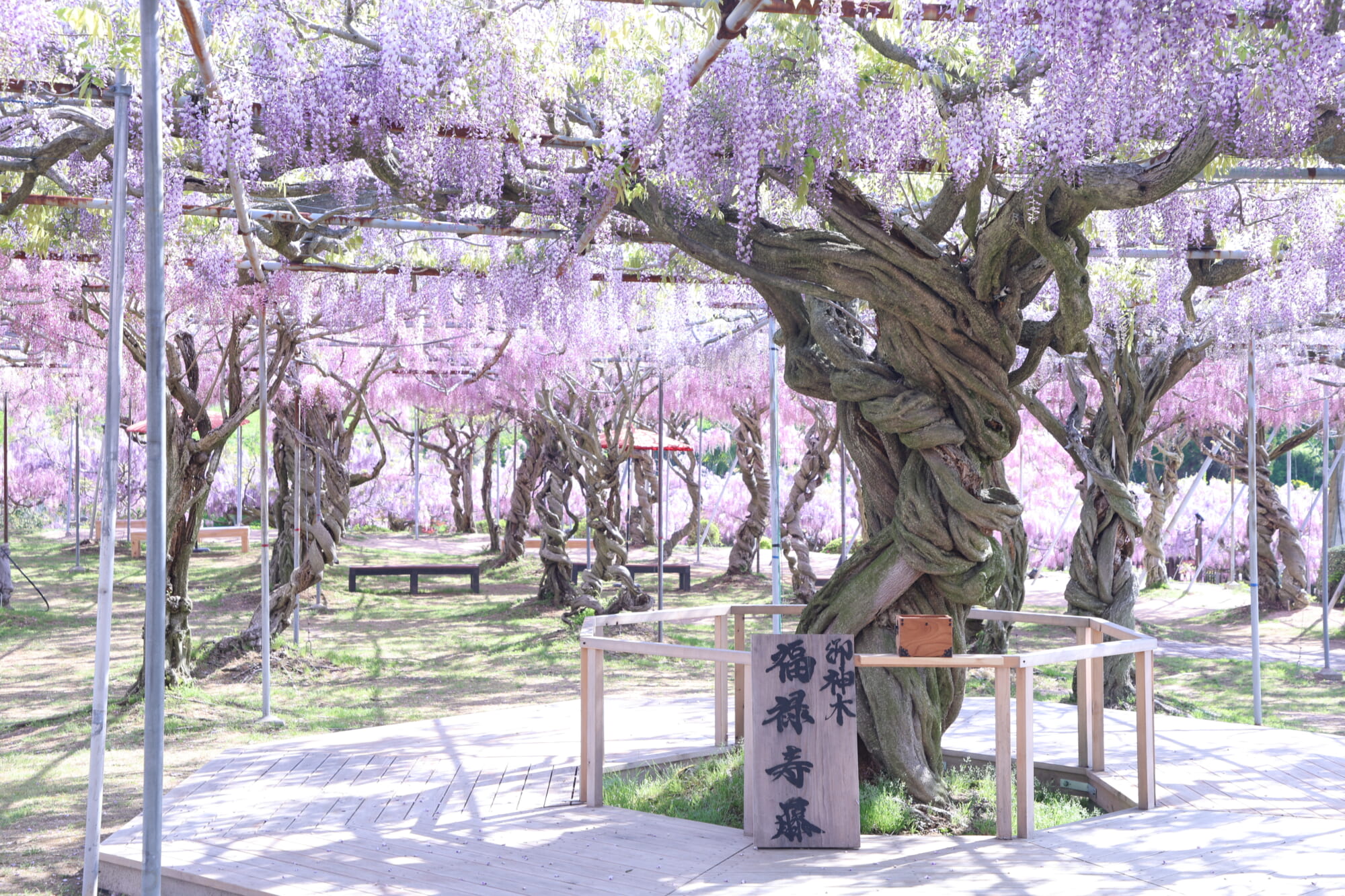 園内でひときわ存在感を放つのが、御神木「福禄寿藤」です。樹齢は約50年で、園内最大規模の一本。福・禄・寿の縁起を名前に宿しています。幹の太さと垂れ下がる花房のボリュームは、写真では伝わりきらない迫力があります。間近に立ったとき、その大きさに思わず立ち止まってしまうほど。