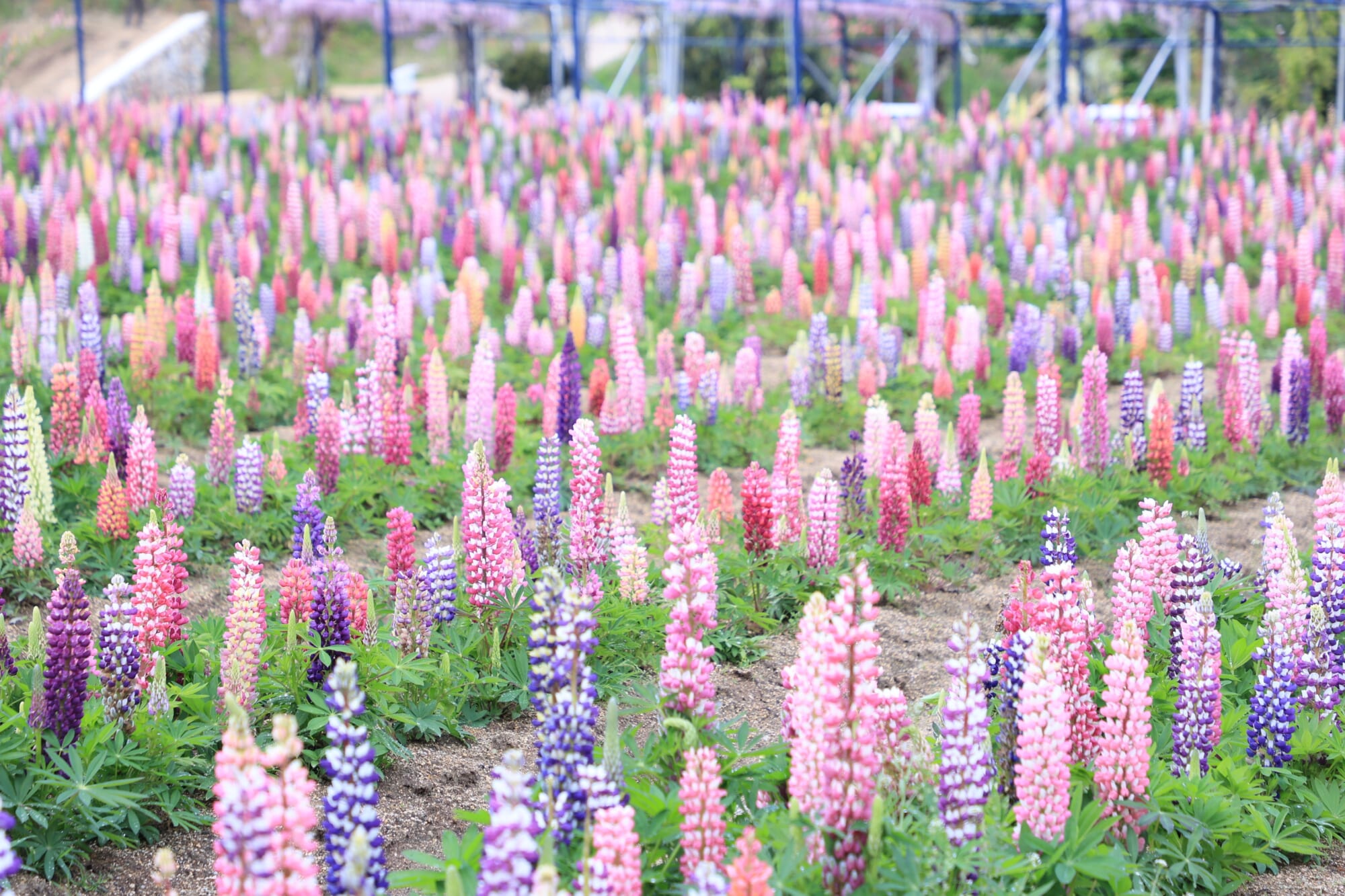 ルピナスには「昇り藤」という別名があります。上向きに咲く花穂が藤の花房に似ていることからついた名です。蝶のような小花が集まった花穂が特徴で、ピンク・白・紫・オレンジと色合いは多彩。13,000株が一面に咲き広がる「昇り藤の谷」は、ふじエリアとはまた異なる明るさがあります。甘い香りが漂い、足を止めて深呼吸したくなる空間です。