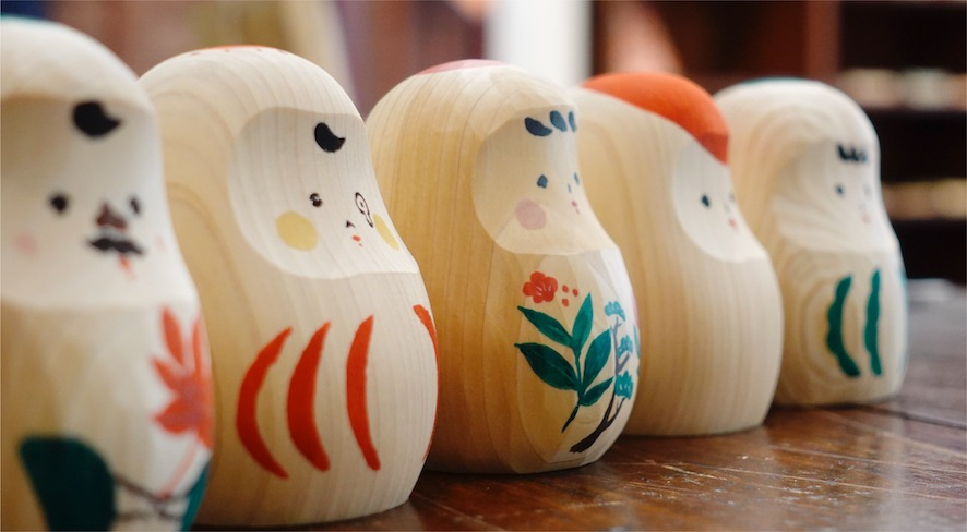 伊豆の間伐材を木地に使い、一つひとつ手作業で削り出し、絵付けされた手のひらサイズの可愛らしいだるまは、伝統的な赤だるまをベースとしつつ、現代的な色使いとやわらかな表情で個性を表現。