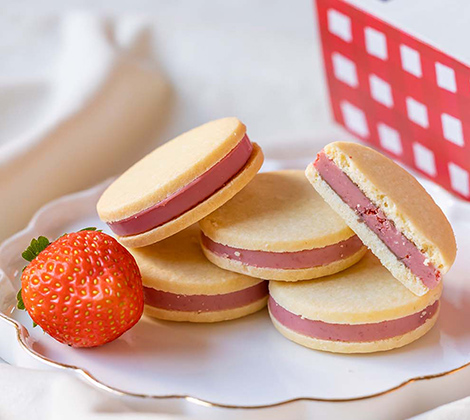 静岡県伊豆の国市にあるいちご専門店「いちごBonBonBERRY 伊豆の国factory」が贈る「いちごのショートケーキクッキー」。一年中いちごスイーツを届ける専門店ならではのこだわりが詰まったサンドクッキーです。