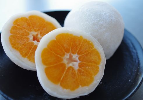 「まるごとみかん大福」は、浜松市北区三ケ日(みっかび)町で栽培された三ヶ日みかんを丸ごと白あんと羽二重餅で包んだ大福です。一口食べれば三ケ日みかんの濃厚な甘さとほどよい酸味による爽やかさが口いっぱいに広がります。