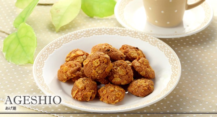 浜松っ子に長年愛される焼き菓子「あげ潮」。オレンジピールやナッツ、レーズンなどをふんだんに練り込み、仕上げにコーンフレークをまぶしたザクザク食感と香ばしさがクセになるクッキーです。