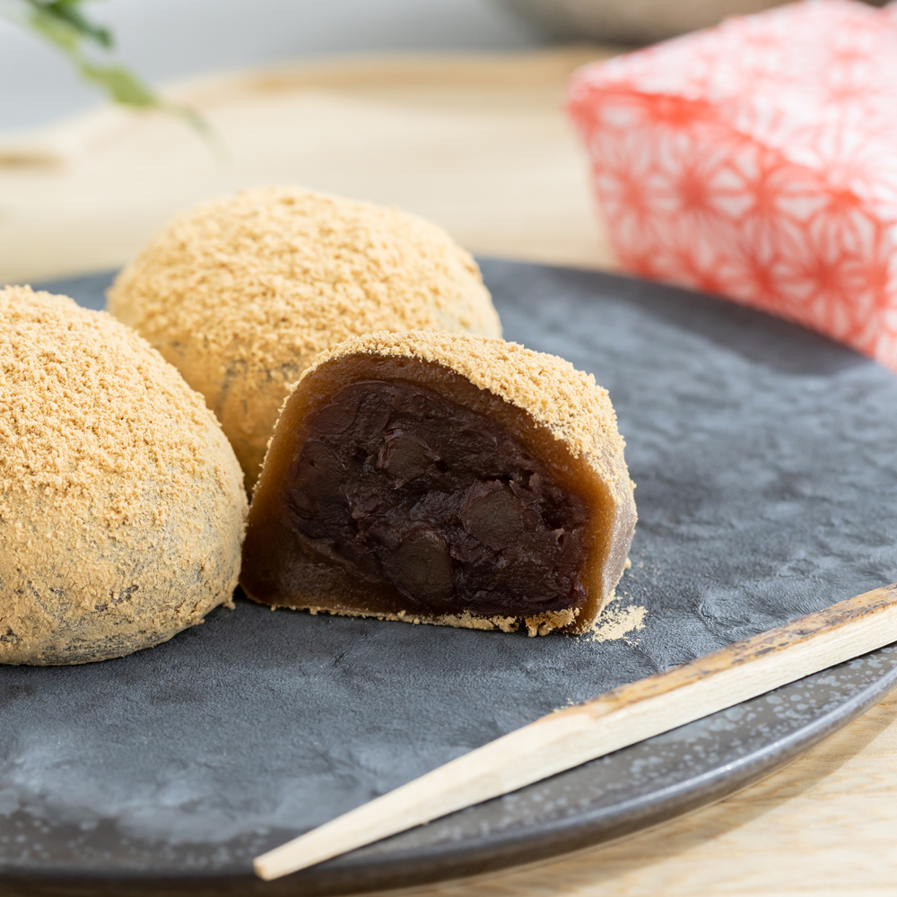 北海道産の大粒の小豆を使用したつぶあんを柔らかい餅に包み、きな粉ともろこし粉をまぶしています。餅生地が薄くもっちり感を感じたと思ったらすぐにあんのずっしり感がくる「小豆餅」。きな粉ともろこし粉が香ばしく、甘さ控えめで上品な後味です。渋めのお茶がよく合う一品は、誰に贈っても喜ばれるお土産です。