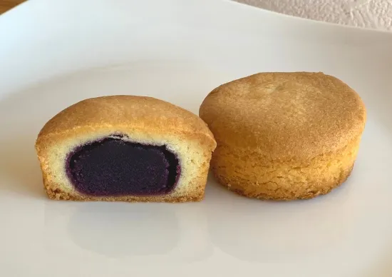 宮古島の太陽をたっぷり浴びて育った紅芋を使用した「美ら恋ガレット」。芳醇なバターの香りと、紅芋の優しい甘さが特徴のガレットです。サクサクとした心地よい食感と、紅芋あんの滑らかさ、そしてバターの塩っ気が織りなす絶妙なハーモニーに、思わず顔がほころびます。