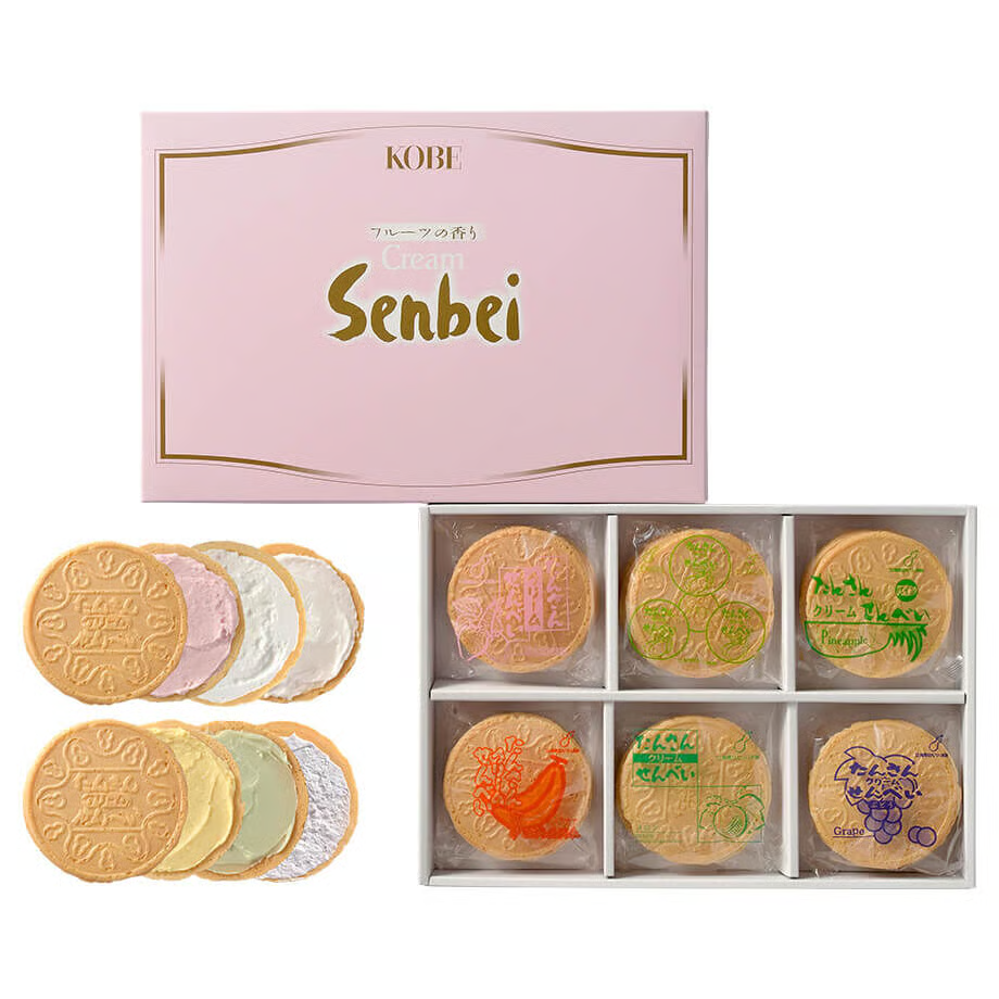 「フルーツの香りせんべい」は、有馬温泉土産の代名詞とも言える炭酸せんべいに、瑞々しいフルーツの香りをプラスしたクリームを挟んだ新感覚の一品です。薄く焼き上げた生地はもちろんサクサクと軽い口当たり。サンドされているクリームのテイストには、パイン・イチゴ・メロン・ブドウ・バナナ・レモンの6種類があります。