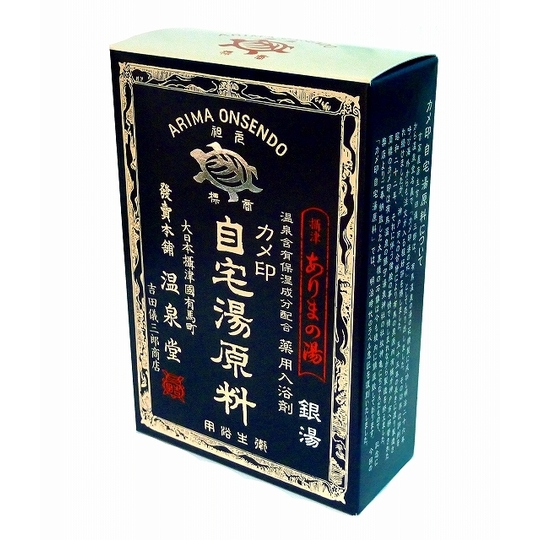 「カメ印 自宅湯原料」は、有馬温泉の代名詞とも言える銀泉の恵みを、ご自宅で手軽に体験できる入浴剤です。有馬温泉の泉質を忠実に再現している「カメ印 自宅湯原料」は、特に鉄分を含んだ褐色の濁り湯が特徴で、肩こりをはじめ、疲労回復、うちみ、リウマチ、荒れ性など、銀泉と同じ効能を得られます。