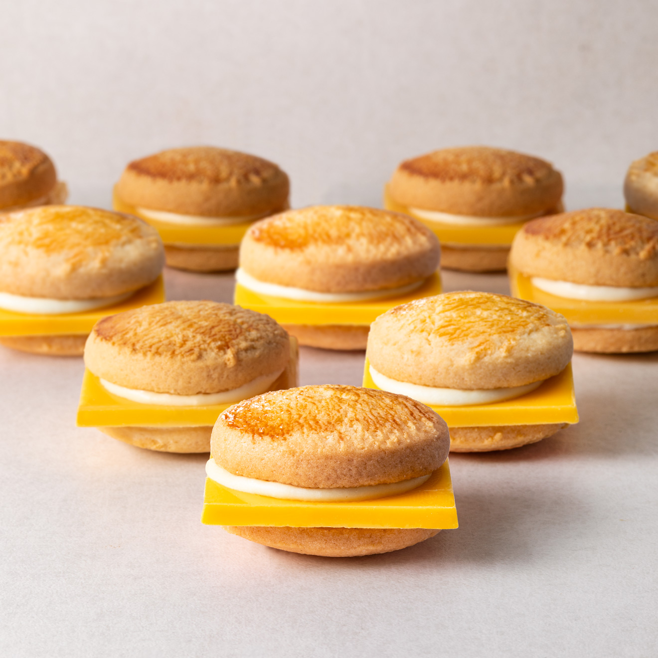 ユニークなハンバーガー型のルックスが目を引く「キャプテンスイーツバーガー」。チーズ香るバンズクッキーに、チェダーチーズとホワイトショコラをブレンドしたチーズショコラ、ホイップショコラを挟んでいます。
