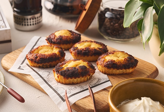 創業当時からシーキューブで人気の商品・ティラミスを、いつでも味わってもらいたいという発想から焼き菓子にした「焼きティラミス」。北海道産のマスカルポーネと小麦を使ったしっとりふわふわ生地に、後入れでコーヒーシロップを注入しており、口に運ぶたびにじゅわっとコーヒーの豊かな風味とほろ苦さが広がります。