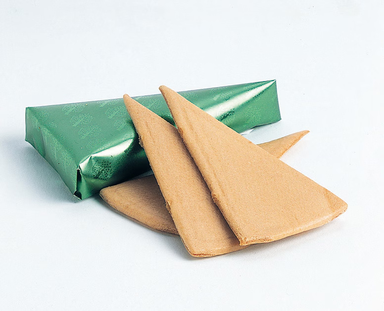 商品名であるエコルセはフランス語で「木の皮」を意味し、丸や三角に巻き上げられた個性的な形も魅力の一つ。プレーンに加え、ミルクチョコレートとホワイトチョコレートを挟んだ種類があり、さまざまな味わいを少量ずつ楽しめます。世代問わず好まれる味で、コーヒー、紅茶、日本茶とも相性抜群。
