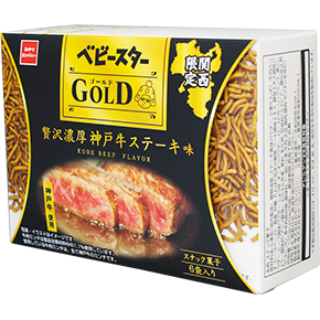 「ベビースターGOLD(贅沢濃厚 神戸牛ステーキ味)」は、誰もが知るロングセラー駄菓子のベビースターラーメンと、神戸のブランド牛・神戸牛がコラボした、地域限定の贅沢なスナックです。「贅沢濃厚 神戸牛ステーキ味」をはじめとしたGOLDシリーズでは、地域特産の高級食材を使用したプレミアム感のあるベビースターラーメンで、通常商品よりもワンランク上の濃厚な味わいを追求したシリーズです。