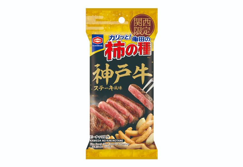 「亀田の柿の種 神戸牛ステーキ風味」は、国民的な人気を誇る米菓・亀田の柿の種が、地域限定フレーバーとして神戸牛の風味をまとった逸品です。単なる醤油味にとどまらず、神戸牛パウダーを使用することで肉の旨味と香辛料、ソースの風味をプラス。通常の柿の種よりも大人向けの贅沢テイストに仕上げられています。
