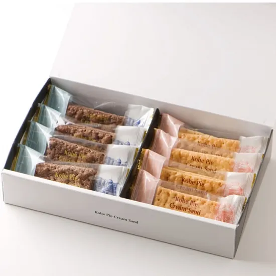 プレーンにはカスタードクリーム、チョコにはチョコクリームがそれぞれ挟まれており、2種類の味わいを楽しめる「神戸パイクリームサンド」。個包装で日持ちもするため、オフィスやフォーマルな場への手土産としても最適です。紅茶やコーヒーとの相性が抜群で、優雅なティータイムを演出したい方へおすすめの一品です。