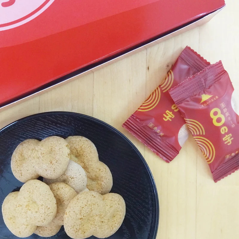 「8の字」は、大正時代にあった「めがね」というお菓子の系譜を継ぐカクゼン桑名屋の看板商品で、静岡の地元で長く愛され続ける素朴な焼き菓子です。その名の通り、縁起の良い「8」の字型に焼き上げられた愛らしい形が特徴。卵と小麦粉をシンプルに配合した生地を、昔ながらの製法でじっくりと焼き上げており、サクッとした軽快な食感と、ふわっとほどける優しい卵の風味が魅力です。