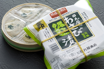 静岡の特産品であるわさびを、伝統の製法でじっくり漬け込んだ、田丸屋本店のロングセラー商品「金印わさび漬」。厳選された国産わさびと、最上級の酒粕を使用しており、清涼感溢れるわさびの辛味と、酒粕の芳醇な旨味が織りなす独特の風味が魅力です。わさびの根の部分を多く配合し、わさびそのものの味わいを感じられるよう風味、辛みが強くなるように仕上げています。
