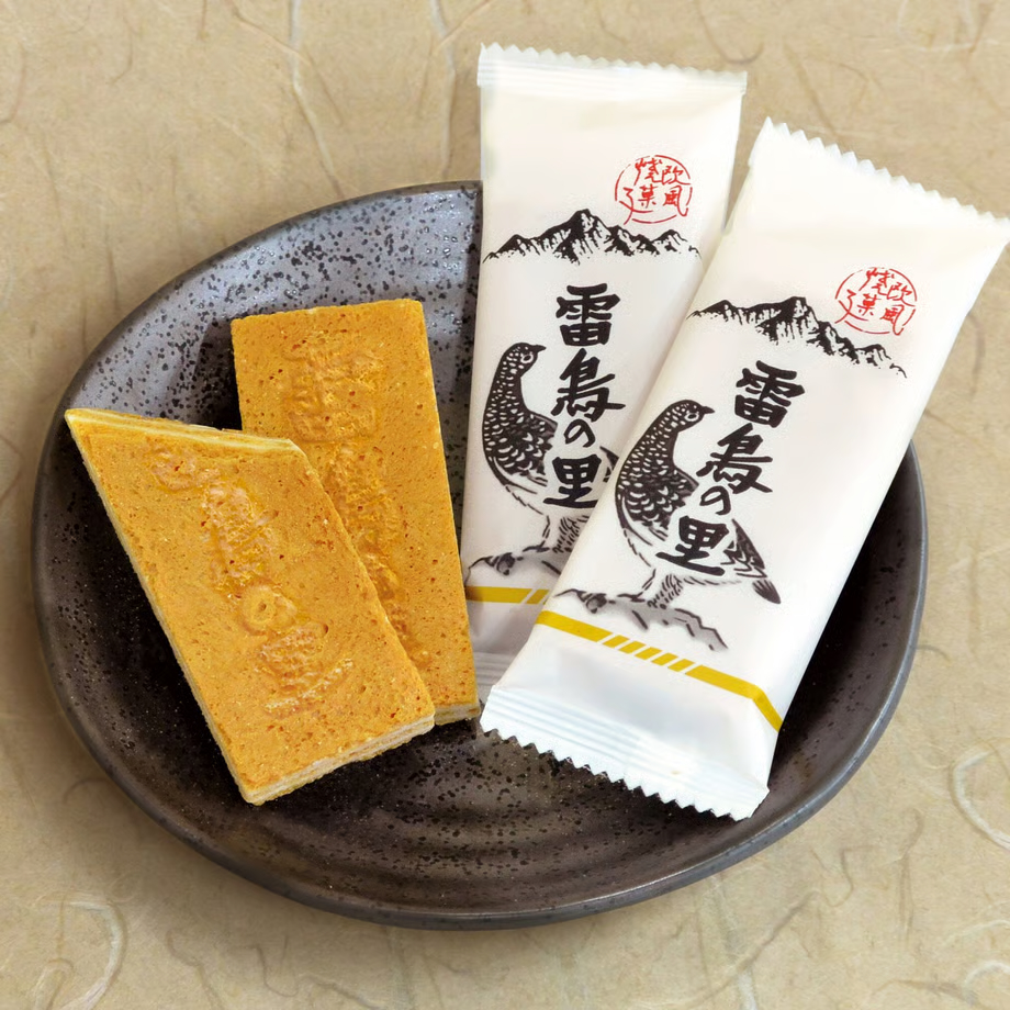 「雷鳥の里」は、長野県の県鳥でもある雷鳥をイメージして作られた銘菓です。誕生から半世紀以上にわたって愛され続ける長野土産の代名詞的存在でもある逸品は、独自の製法で焼き上げられた欧風せんべいにクリームをサンド。厚みがありながらも、サクッと軽やかで歯切れが良く、口の中に豊かな香ばしさが広がります。