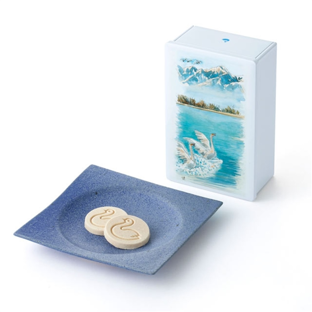 「白鳥の湖」は、スペインで「幸せを呼ぶお菓子」として親しまれるポルポローネをベースに、開運堂が独自にアレンジしたお菓子です。白鳥の愛らしい型押しと落雁に似たホロホロとした口溶け、ほんのり香るシナモンの香りが特徴。鼻に抜けるスパイスの香りと控えめな甘さが心まで満たしてくれます。