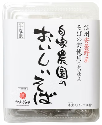 「自家農園のおいしいそば」は、そばの聖地・信州において、原料の栽培から製麺まで一貫して手がける鎌倉麺業のこだわりが詰まった半生そばです。自家農園で丹精込めて育てられたそばの実を100%使用し、挽きたて、打ちたての風味を閉じ込めています。