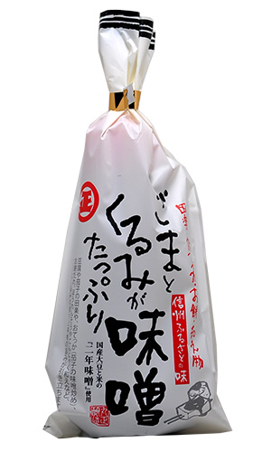 丸正醸造こだわりの二年味噌をベースに、ごまとくるみをたっぷり入れた「ごまとくるみがたっぷり味噌」。二年味噌は良質な国産大豆と米、天然水で仕込んでおり、コクと旨味、少しの酸味のバランスが抜群です。
