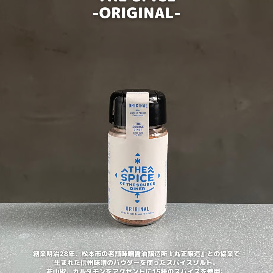 「The SPICE “ORIGINAL”」は、松本の人気ダイナー・The Source Dinerと老舗味噌・醤油蔵の丸正醸造のコラボ商品です。長野の代名詞である味噌のパウダーをベースに、カルダモンと花山椒など15種類ほどのスパイスをブレンド。日本人になじみ深い味噌がベースになっているため、お肉はもちろん、ご飯にかけても、そのままペロッとなめて酒のアテにするなど、オールマイティな使い方が可能です。