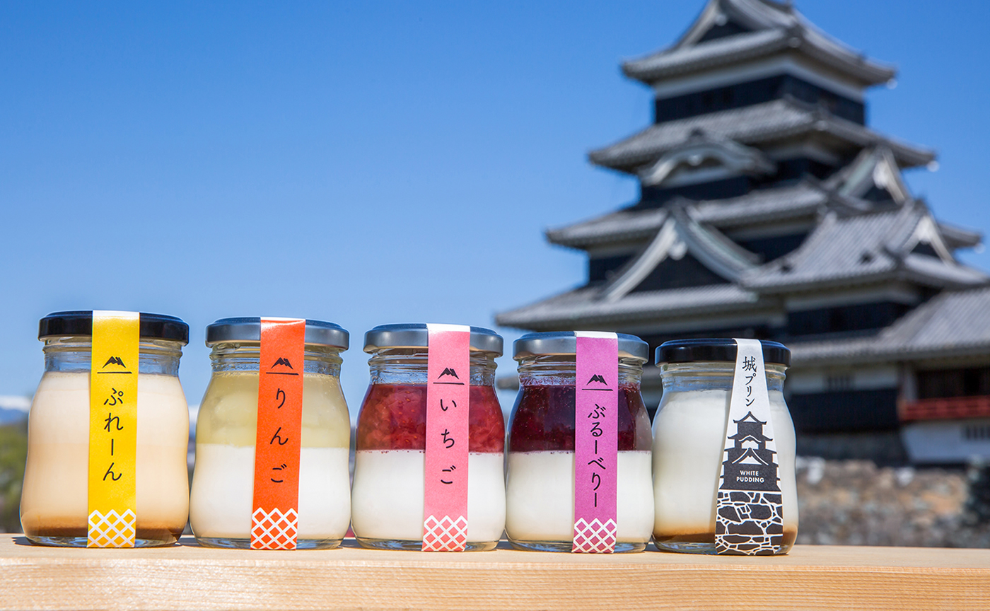 いちご、ブルーベリー、りんごの定番商品に加えて、季節限定テイストも登場。プリンそのものを楽しみたい方には、城(白)プリンとプレーンがおすすめです。可愛らしい小瓶のデザインは、自分へのご褒美スイーツとしても気分を上げてくれます。フレッシュな美味しさを追求しているため、信州ならではのスイーツを求めている方や、松本観光の思い出を共有したい方におすすめの逸品です。