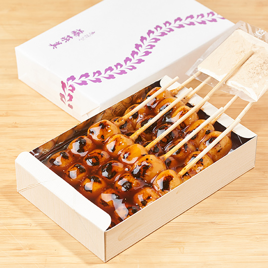 地元・京都の方が好むあっさりとした甘さのタレが特徴の藤菜美の「みたらしだんご」。蓋を開けた瞬間に広がる香ばしさと、透明感のある深いコクが特徴です。お団子は、職人が直火でじっくりと焼き上げており、口の中でとろけるような柔らかさと程よい弾力を両立。別添えのきな粉をたっぷりまぶせば、香ばしさが一段と引き立ち、味の変化を楽しめます。