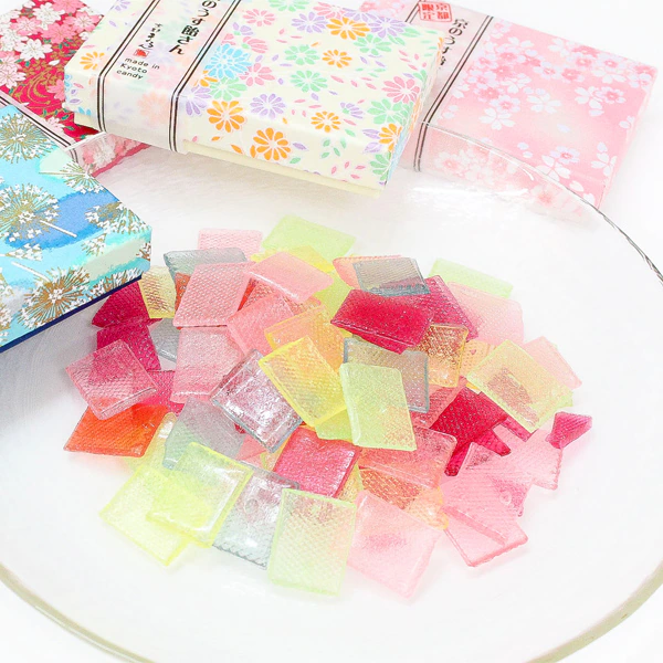 「京のうす飴さん」は、京都を代表する伝統工芸品・京友禅をイメージした色とりどりのフルーツ飴です。ガラス細工のような薄さで、パリパリとした食感が特徴。パッケージの種類によって入っている味が異なり、レモン、メロン、桃、いちご、サイダーなどさまざまな味を楽しめます。