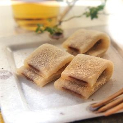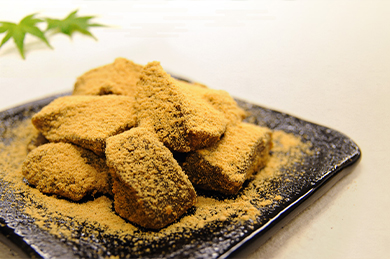 局屋立春の「黒糖わらび餅」は、生地に黒糖を練り込んだコクのある甘さと柔らかな食感が特徴のわらび餅です。手作りならではの素朴で上品な味わいに加えて、香り高いきな粉がたっぷりまぶされており、香ばしさもプラス。口のなかでとろける味わいには抹茶がよく合います。