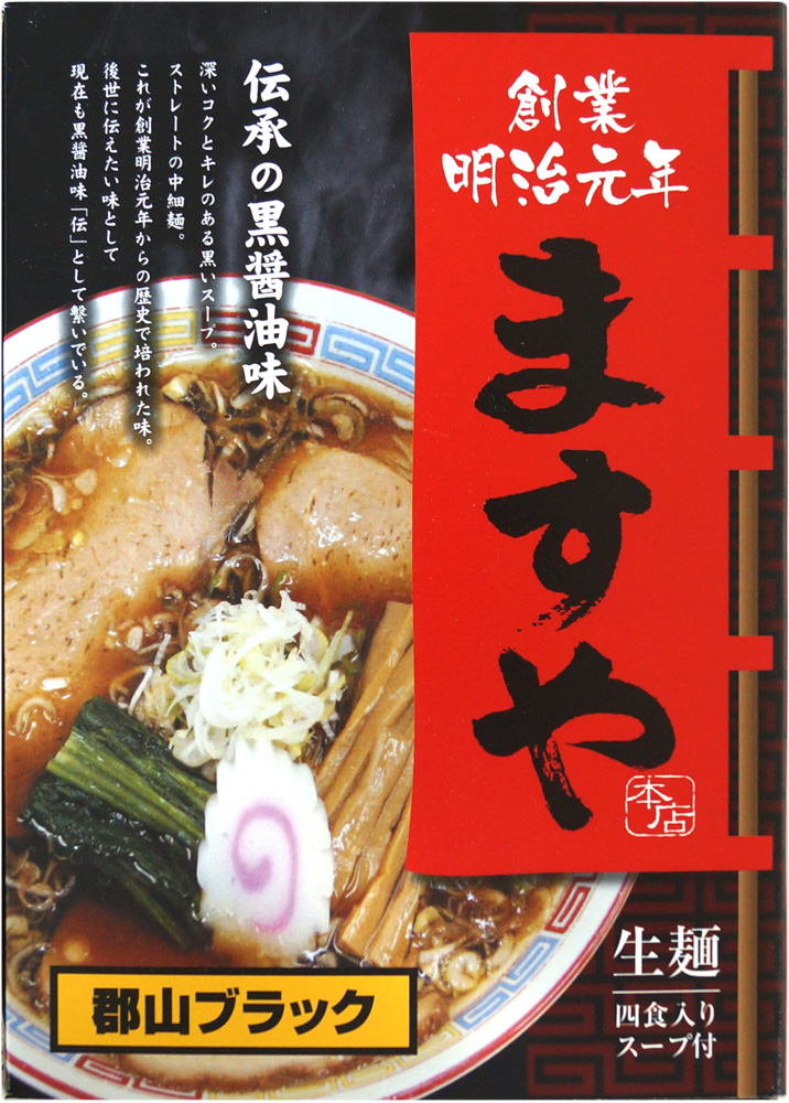 「ますや本店 黒醤油ラーメン」は、郡山ご当地グルメ「郡山ブラック」の名店、ますや本店の味を自宅で再現できる本格生ラーメンです。最大の特徴は、見た目の黒さに反して驚くほどあっさりとキレのある漆黒のスープ。長年継承された醤油タレベースのスープのコクと旨味が、喉越しの良い麺にしっかり絡みます。