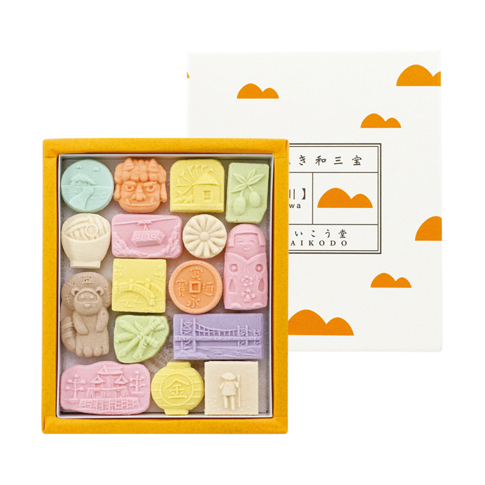 「和三宝めぐり(香川)」は、香川県特産の希少な「讃岐和三盆」を100%使用し、香川の名所や名産を可愛らしい型に打ち出した干菓子です。伝統的な「和三宝製法」で仕上げられた干菓子は、口に含んだ瞬間にスーッと溶け、上品な甘みと香りが広がります。