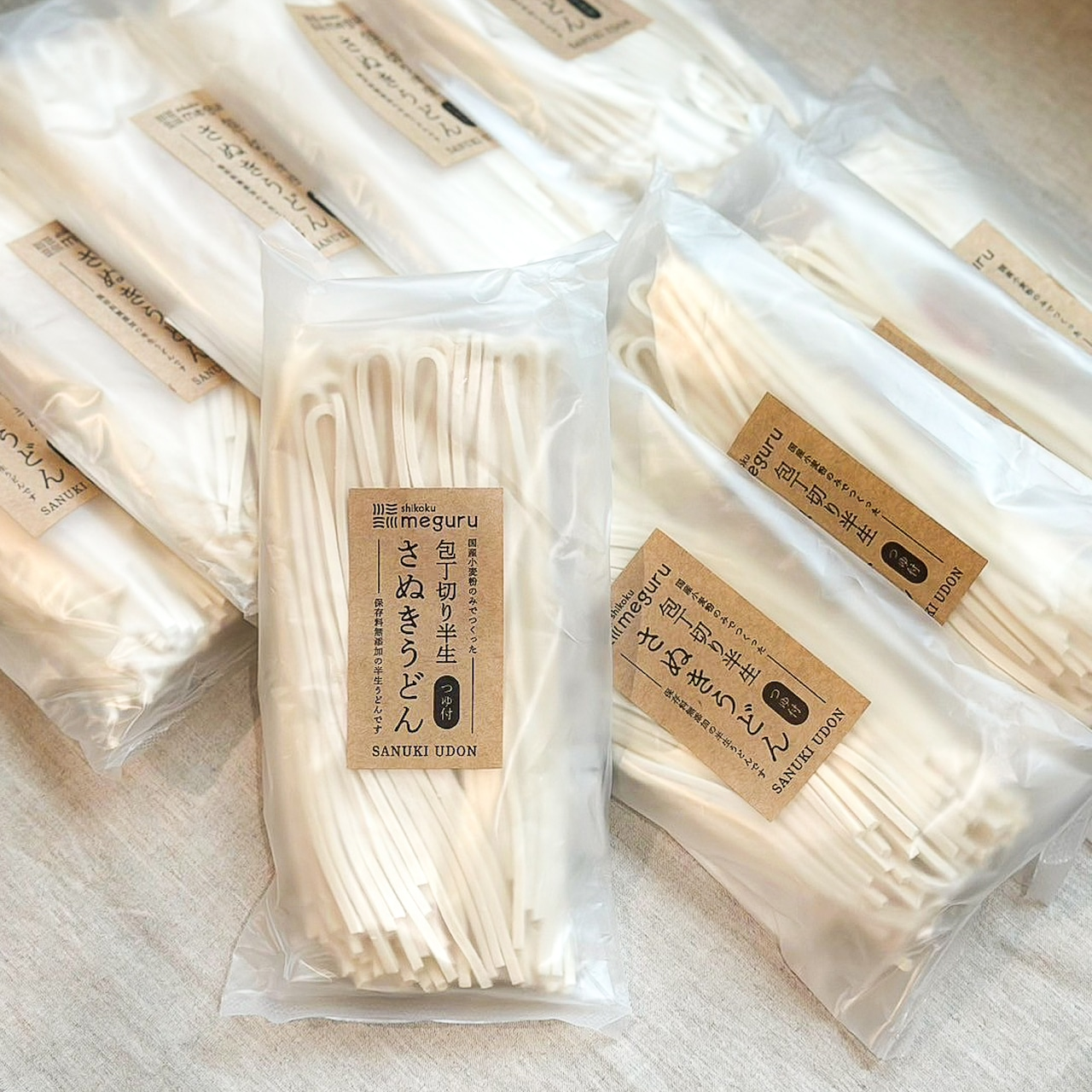 「包丁切り半生さぬきうどんセット」は、創業百余年の香川の老舗・藤井製麺と、四国の魅力を発信する「shikoku meguru」がタッグを組んだ特別仕様のうどんセットです。職人が一釜ずつ丹念に茹で上げる「包丁切り」の技法を再現した半生麺は、まるでお店で食べるような、エッジの効いたコシと滑らかな喉ごしが楽しめます。
