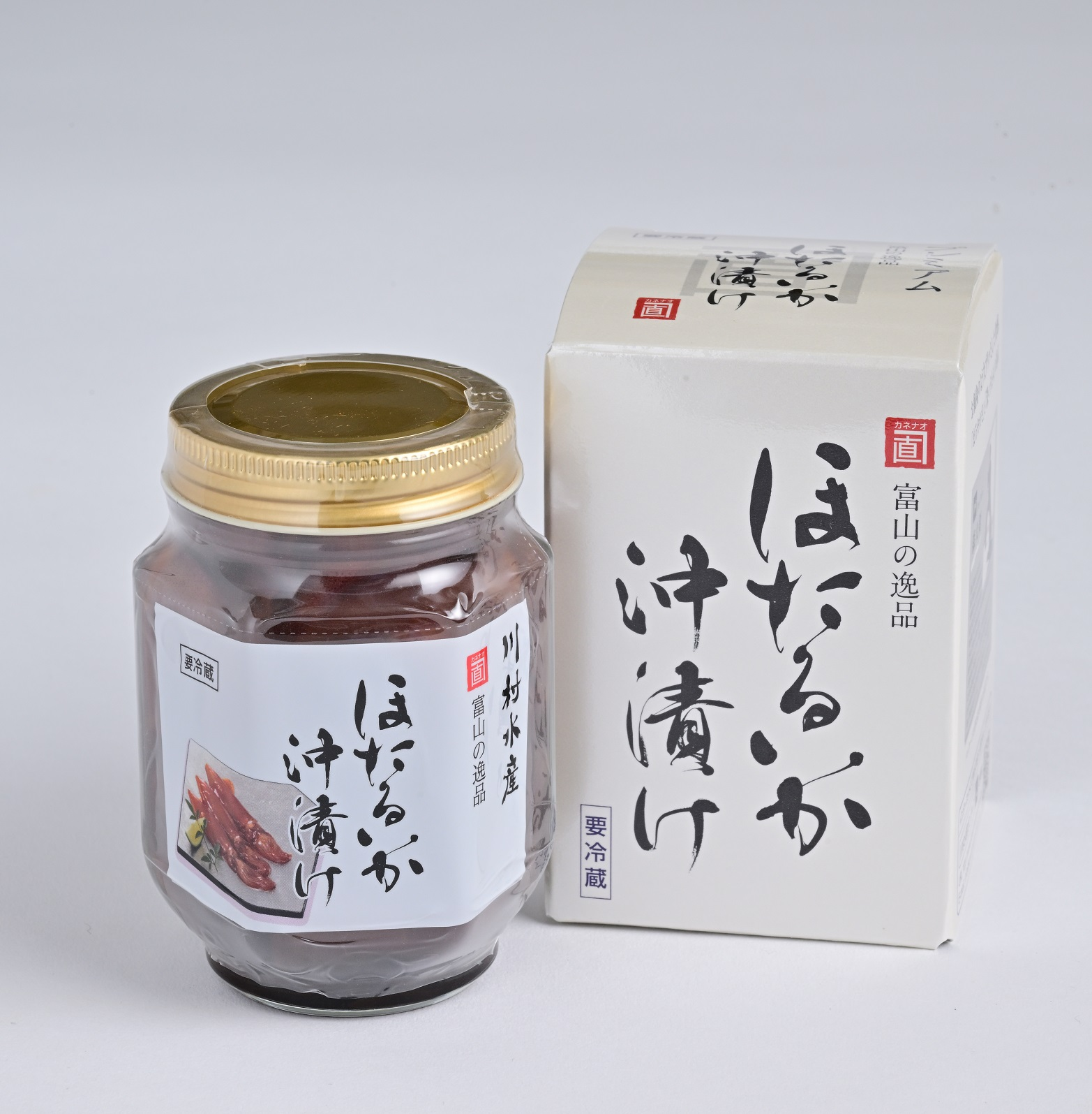「プレミアムほたるいか沖漬け」は、富山湾の名産であるホタルイカのなかでも厳選したものを使用した塩辛です。ホタルイカは目玉を丁寧に取り除いており、食べやすさ抜群。海洋深層水と100%国産大豆を使用した特製ブレンド醤油で仕込まれています。