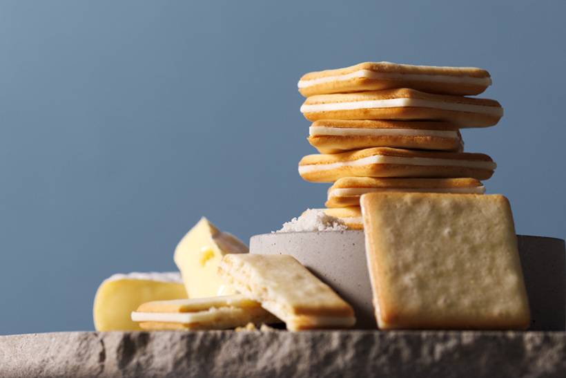 フランス産ゲランドの塩と北海道産牛乳を使った生地に、カマンベールチーズのチョコレートをサンドしたクッキー。サクッと軽やかな食感に、ほんのり塩味の効いた生地とチーズのコクが重なり、甘さと塩味のバランスが引き立つ味わいが特徴です。ミルクとチーズの風味が調和した、奥行きのあるおいしさが楽しめます。