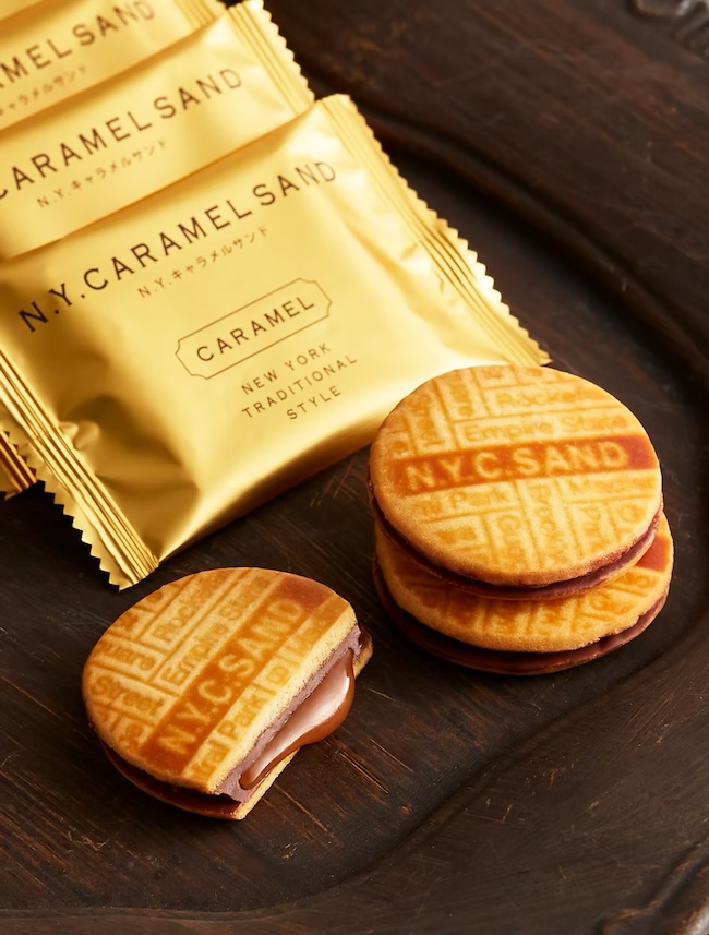 「N.Y.キャラメルサンド」は、ニューヨークの菓子文化に着想を得たキャラメルサンド。バターの風味豊かなクッキーで、口どけのよいキャラメルを挟み、さらにチョコレートでコーティングすることで、香ばしさとコク、なめらかな甘みが重なり合う味わいに仕上げられています。サクッとしたクッキーの食感と、とろりと広がるキャラメルの口どけが印象的な一品です。