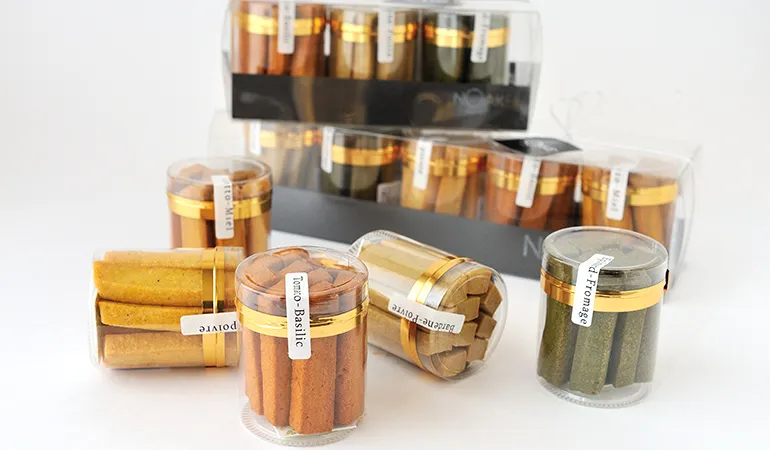 野菜の栄養を手軽に摂れるため、健康を意識している方にも贈りやすいのがポイント。おやつとしてはもちろん、塩味が利いているため、ワインやシャンパンなどお酒のお供にも最適です。素朴ながらも洗練されたパッケージと、野菜の彩りが鮮やかな一品は、誰に贈っても外さない一品です。