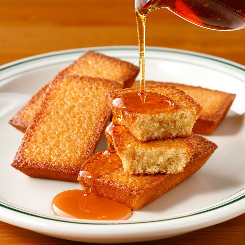 「バターフィナンシェ」は、ヨーロッパ産発酵バターとフランス産ゲランドの塩を使い、こんがりと焼き上げたフィナンシェ。表面はきつね色に香ばしく、中はしっとりとした口当たりで、焼き上げたあとに染み込ませたカナダ・ケベック州産メープルシロップが、ジュワッと広がる独特の食感を生み出しています。発酵バターのコクに、メープルのやさしい甘みが重なり、ひと口ごとに奥行きのある味わいが楽しめます。
