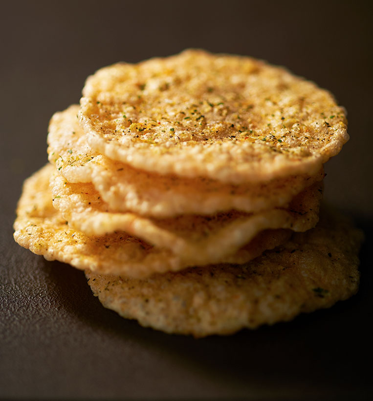 「天ぷらせんべい」は、甘みのある天然えびをたっぷりと使い、岩津ねぎなど5種の食材でかき揚げの味わいを表現したおせんべい。サクサクと軽やかな食感とともに、えびの旨みと香ばしさが広がり、ひと口ごとに奥行きのある風味が楽しめます。揚げたてのかき揚げを思わせるような、軽快であとを引く味わいが特徴です。