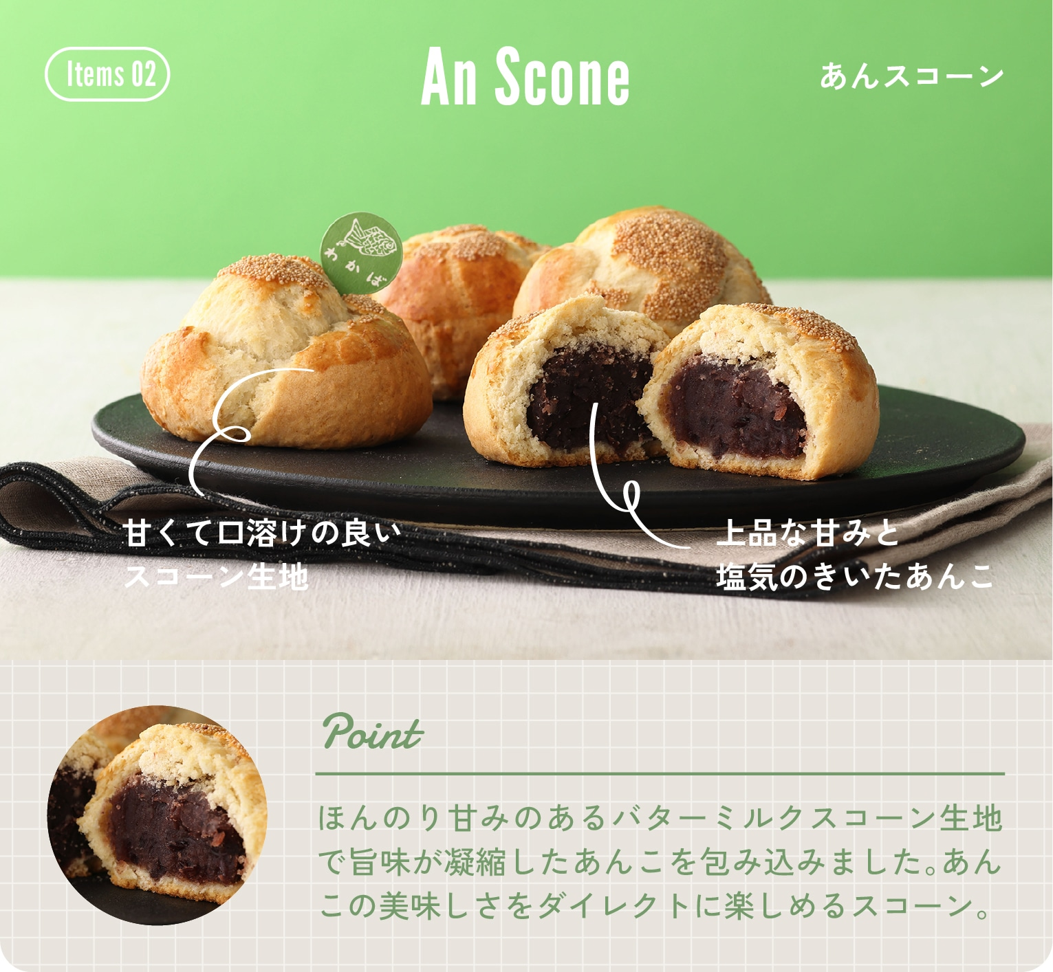 「たいやき わかば」のあんスコーンは、四谷の名店「たいやき わかば」とのコラボレーションで生まれた一品。上品な甘みとほどよい塩気のあるあんこを、フランス産発酵バターを使ったスコーン生地で包み込み、和と洋が調和した味わいに仕上げられています。外はさっくり、中はしっとりとした食感で、あんこのやさしい甘みとバターのコクが重なり合うのが特徴です。