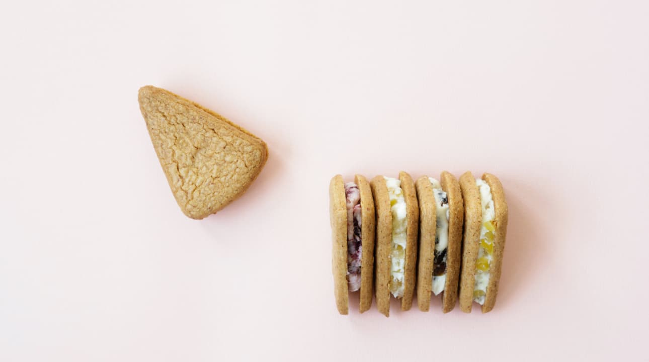 看板商品のフルーツタルトを「そのまま持ち歩けるように」という想いから誕生した贅沢なスイーツ「旅するタルトサンド」。オハコルテ自慢の歯ざわりのいい厚焼きのタルト生地には、濃厚なバタークリームと、旨味が凝縮されたドライフルーツがたっぷり。レーズン、マンゴー、蜜りんご、クランベリーの4種があり、どれもフルーツの個性がしっかりと感じられるリッチな味わいです。