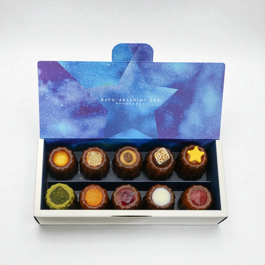 沖縄にある良間島産のサトウキビから作られた黒糖を使用して作った、ほうき星のオリジナルカヌレです。沖縄の食材を使用して作られており、テイストは「プレーン」「パイナップル」「沖縄珈琲」「沖縄ミルク」「ドラゴンフルーツ&シークヮーサー」「沖縄の緑茶(名護市産)」「星型ホワイトチョコ×バナナ」「ラズベリー&マスカルポーネ」「泡盛(古酒)」「島いちご」と、沖縄らしさ全開の10種類ものバリエーションが用意されています。