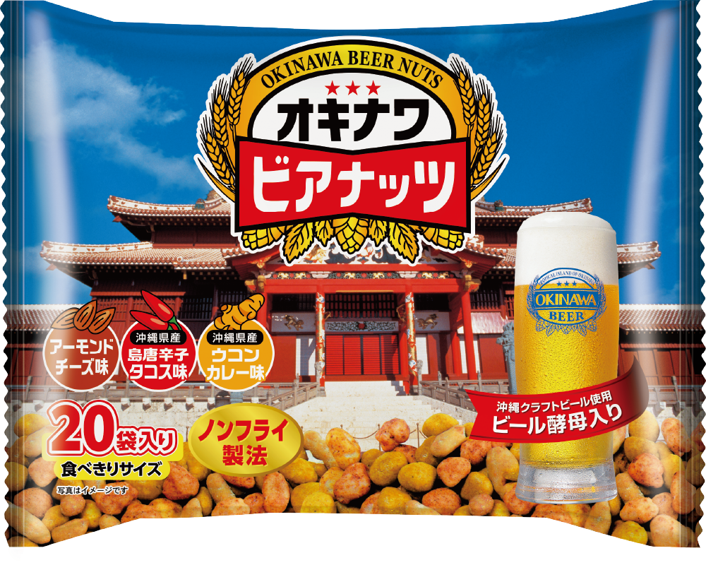 「オキナワビアナッツ」は、オリオンビール製造時に使用したビール酵母を衣に練り込み、落花生にコーティングさせた豆菓子です。テイストは沖縄らしく、かつ幅広い世代に好まれる「タコス島唐辛子」「ウコンカレー味」「アーモンドチーズ味」の3種類。ヘルシーなノンフライなので、健康志向の人へのお土産にもおすすめです。