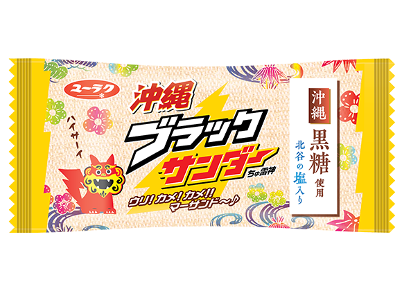 「沖縄ブラックサンダー」は、ココアクッキーとプレーンビスケットをチョコレートでコーティングした大人気お菓子・ブラックサンダーの沖縄限定商品です。沖縄県特産の沖縄黒糖と北谷の塩を使用。ほんのりとした塩気が黒糖の優しい甘さを引き立てます。