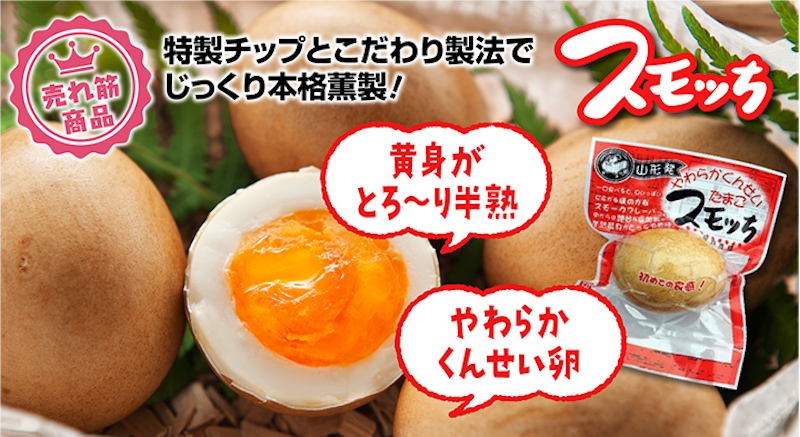 山形名物として10年以上もの間、親しまれている半熟くんせい卵です。原材料は鶏卵と食塩のみ。桜の木とサクランボの木をブレンドした特製チップでスモークしているので、燻製ならではの風味を程よく感じられます。