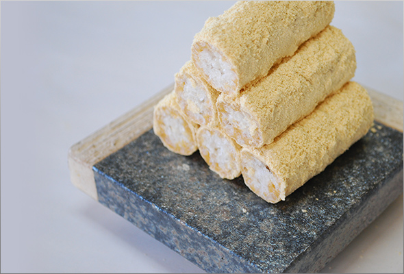 蒸したもち米を伸ばして乾燥させ、水飴や砂糖で棒状に固め、きな粉をまぶした埼玉銘菓「五家宝(ごかぼう)」。1818~1829年に「五嘉棒」の名で売り出されたことが始まりとされています。その後、何度か名前を変え、最終的には「五穀は家の宝である」という意味を込めて現在の「五家宝」に落ち着いています。