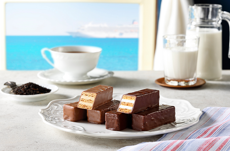 「横濱ミルフィユ」は、ミルククリームと香り高い紅茶クリームをサクサクのパイにサンドして、チョコレートでコーティングしたパイ菓子です。コーヒーや紅茶をはじめ、お茶やワインなどとも合う「横濱ミルフィユ」。サクッと軽快で後味引く甘さはつい手が伸びる美味しさです。