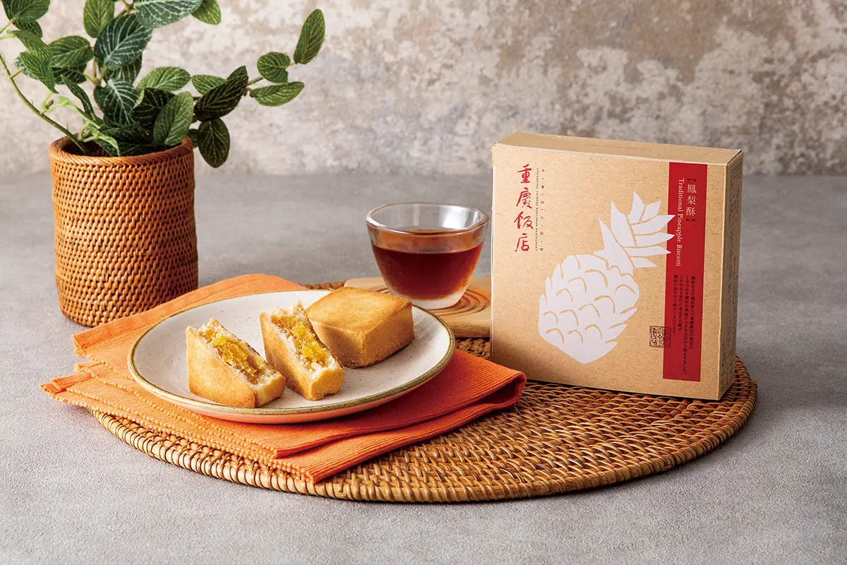 台湾の定番土産パイナップルケーキ「鳳梨酥(ほうりんす)」。重慶飯店の鳳梨酥は発酵バターを使用した、風味豊かでほろほろとした口溶けが特徴のクッキーに、優しい甘みのパイナップルジャムを包んでいます。