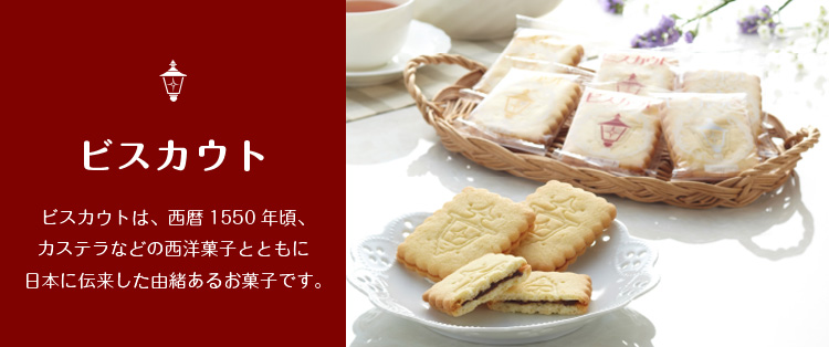 ポルトガル語でビスケットを意味する「ビスカウト」。1550年頃にカステラなどの西洋菓子と一緒に伝来したお菓子です。厚みのあるビスケットのなかには、甘さ控えめで上品クリームがサンドされています。