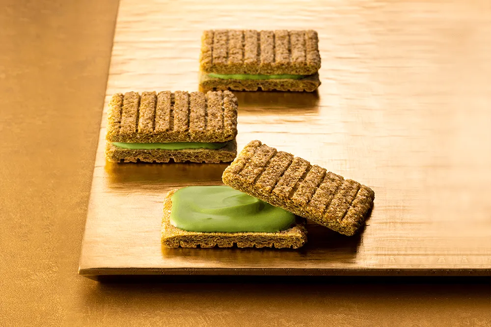 全国的に人気の「シュガーバターの木」から登場した、名古屋地区でしか手に入らない限定フレーバー「お抹茶ショコラ」。愛知県西尾産抹茶を贅沢に使用しているのが最大の特徴です。石臼挽きされた抹茶の豊かな香りを生地とショコラの両方にたっぷりと練り込んでおり、独自のシリアル生地の香ばしさと抹茶のほろ苦いコクが絶妙に溶け合い、甘さ控えめで大人な味わいに仕上がっています。